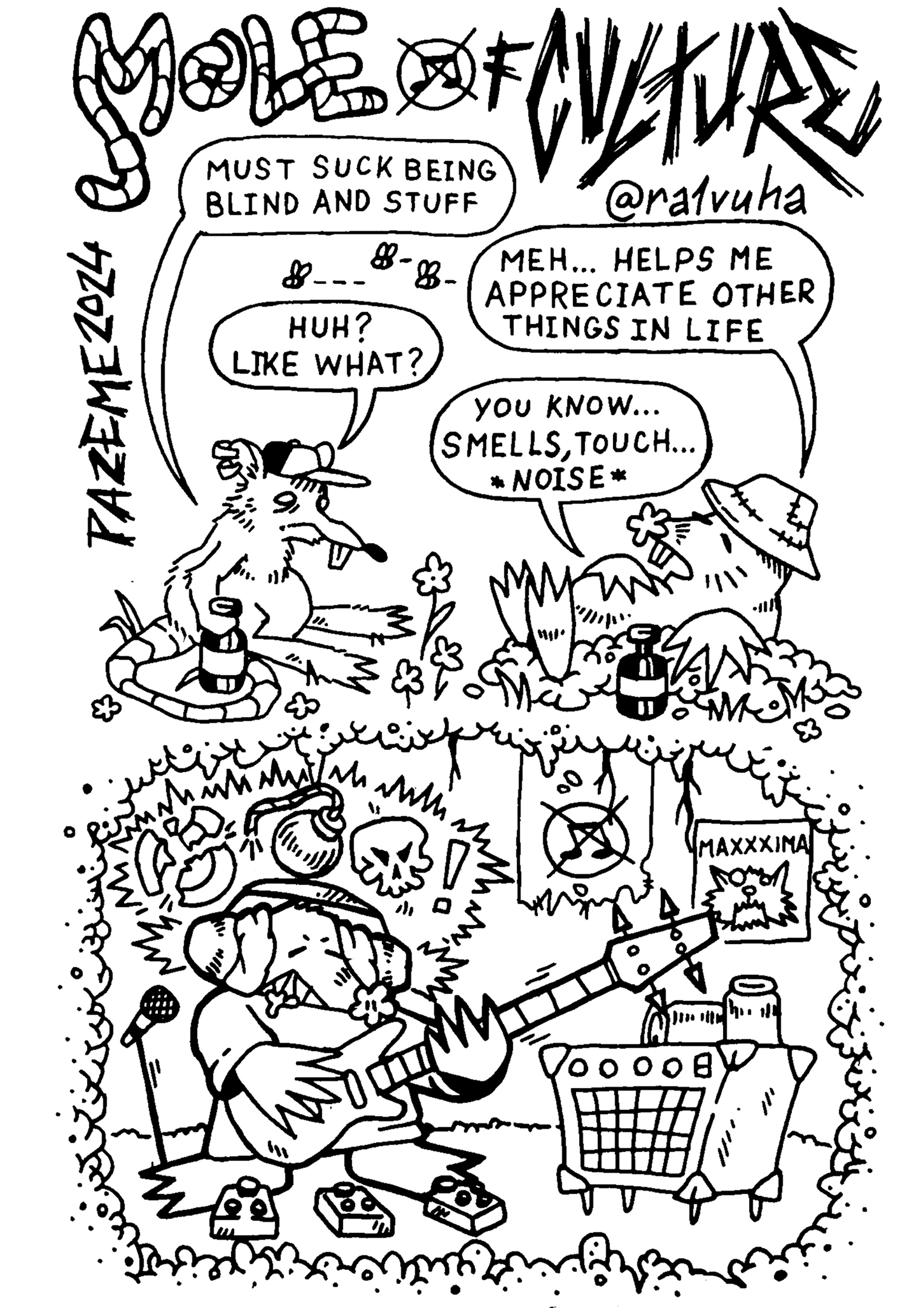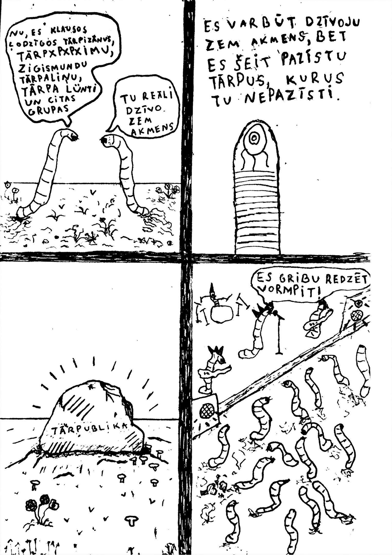 The theme of the first issue is “Underground”, so the comics are about the lives of underground animals and bugs, worms, the underground music scene, jokes about caves and ironies about life underground and under oppressive systems.