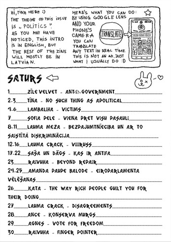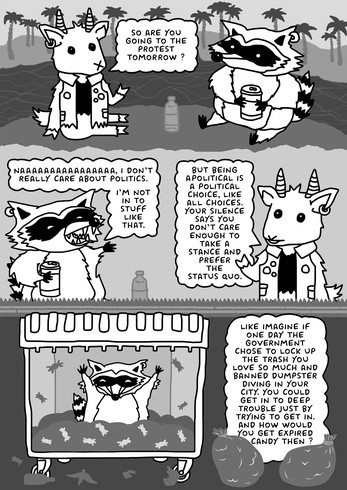 The zine consists of comics submitted by local and some foreign artists, about the theme of Politics. Comics about ongoing wars, misinformation, capitalism, being politically active, voting, direct action and more.